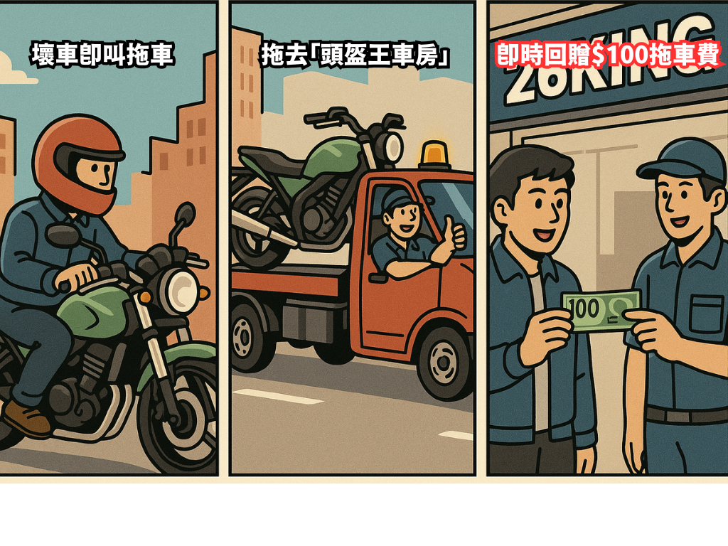 電單車在路上突然死火拋錨,或不幸遇上意外要即時拖走,車主往往會擔心拖車費用高昂,或未能立即決定如何維修而猶豫不決。為了讓車主遇事能時能夠更安心快捷處理,頭盔王/26KING 推出「拖車現金回贈計劃」,只要將電單車拖至頭盔王車房,即可獲得HK$100拖車費現金回贈。本計劃不設限任何拖車公司,即使最終決定不在頭盔王車房進行維修,仍可享有回贈優惠。